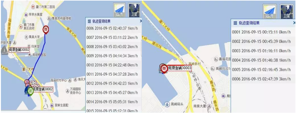 9月15日7:00超級臺風“莫蘭蒂”剛過,廈門漁港監(jiān)督局接到“廈門環(huán)海灣休閑漁業(yè)公司”求助,漁業(yè)公司9月14日進入高崎漁港并停泊在港區(qū)北口門水域避風的4艘休閑漁船 有2艘“失蹤”,漁監(jiān)人員立即趕到現場勘查,兩艘休閑漁船受損,其余兩艘休閑漁船不見蹤跡,水面無明顯漂浮物。漁業(yè)公司船只裝有我司自有研發(fā)的“太陽能定位裝置”,漁監(jiān)局通過我司平臺“北斗之星 ”調取安裝在該船的“太陽能定位裝置”的軌跡回放,獲取了船只在9月15日00:00—07:00臺風登陸期間的軌跡,軌跡回放顯示“閩廈漁輔30002”漂移5小時約3.5公里,最后定位信號在集美京閩北海灣酒店附近,另外一艘“閩廈漁輔30003”最后定位信號在漁港北口門水域。初步判斷為臺風登陸時風力過大,繩斷、撞擊等造成一艘沉沒,另外一艘漂走,經船主確認和港內探摸,與軌跡分析一致。